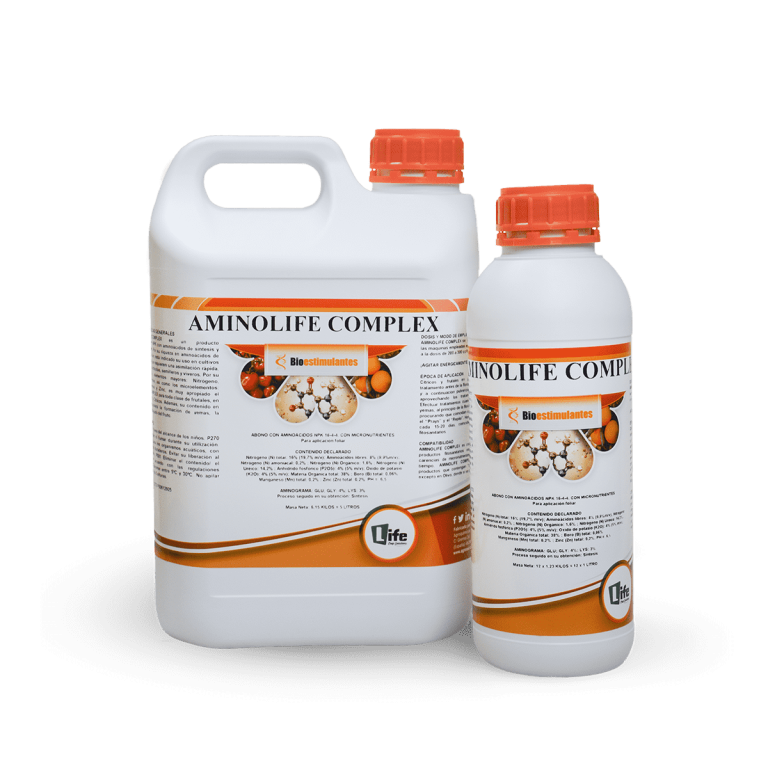 Bioactivador biológico con aminoácidos de síntesis de bajo peso molecular que contiene microelementos. La característica fundamental de AMINOLIFE es su elevada riqueza en aminoácidos, los cuales son los elementos fundamentales de la vida y son comunes en todos los seres vivos, vegetales y animales. Al agrupar los aminoácidos se forman las proteínas, que son indispensables para el desarrollo de los seres vivos.