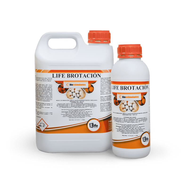 Corrector de carencias líquido en el que el Zinc y el Manganeso se encuentran “complejados” por el Acido Heptaglucónico. Además, contiene una elevada concentración de Aminoácidos libres y de materia orgánica proteica. LIFE BROTACIÓN es un bioestimulante que favorece los procesos de nutrición vegetal. Activa los enzimas para catalizar la energía en los momentos de mayor demanda, estimulando el crecimiento de la planta. Previene y corrige de forma eficiente las carencias de Zinc y Manganeso. Los Aminoácidos y el Nitrógeno ureico que contiene mejoran sustancialmente la asimilación y la distribución dentro de la planta de dichos microelementos.