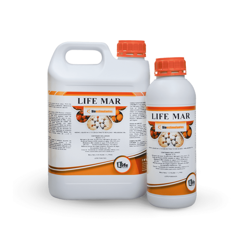 Solución de extracto puro de algas marinas con Nitrógeno, Potasio y Molibdeno. Las algas marinas son ricas en Citoquininas, Auxinas y Giberelinas y son seleccionadas y tratadas de forma que, conservando intactos todos sus principios nutritivos, sean fácilmente absorbibles por la planta. Activan el crecimiento del vegetal, aumentando la calidad, producción y homogeneidad de los frutos. Al mismo tiempo, LIFE-MAR contiene cantidades de Nitrógeno, Potasio y Molibdeno suficientes para el correcto crecimiento del vegetal.